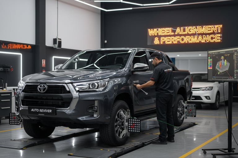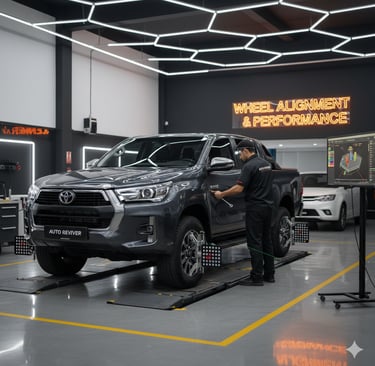 Restore the handling and tire life with Auto Reviver's precision Wheel Alignment service. Misaligned wheels, often caused by rough terrain or daily driving impacts, lead to uneven tire wear, pulling, and poor fuel efficiency—issues that are especially common for rugged trucks like the Hilux.